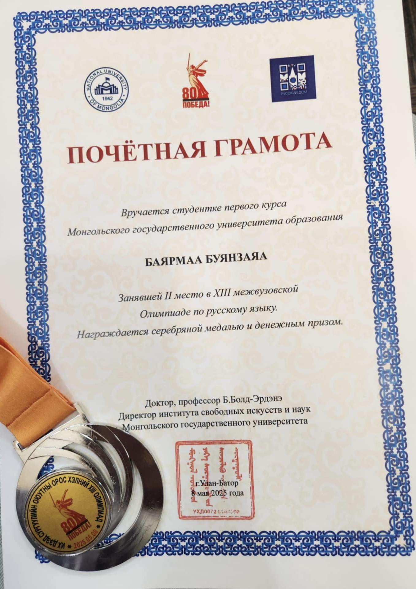 Их дээд сургуулийн оюутнуудын дунд зохион байгуулдаг орос хэлний XIII олимпиадын мэргэжлийн ангилалд амжилттай оролцож, 2-р байр эзэлсэн ОАХ-1 ангийн оюутан Б.Буянзаяадаа халуун баяр хүргээд илүү их амжилт хүсье! Тэнхим. 2025.05.08